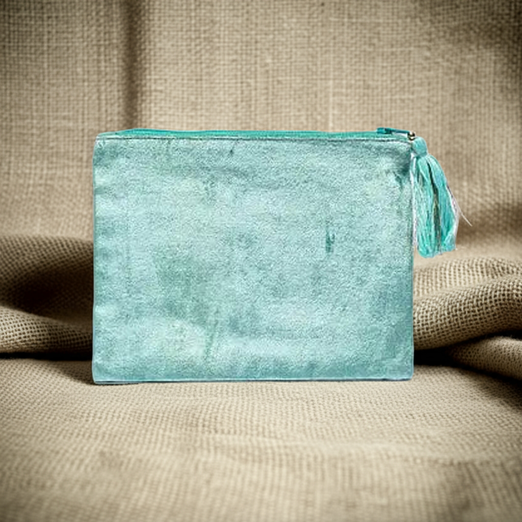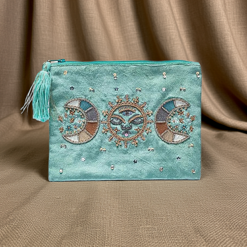 Porta sempre con te la magia del cielo notturno. Questa borsina in velluto color turchese è impreziosita da un ricamo artigianale che raffigura le fasi lunari e un sole mistico con terzo occhio, eseguito con perline, paillettes e micro-borchie dorate. Il tiralampo con nappina tono su tono aggiunge movimento e un tocco boho-chic.